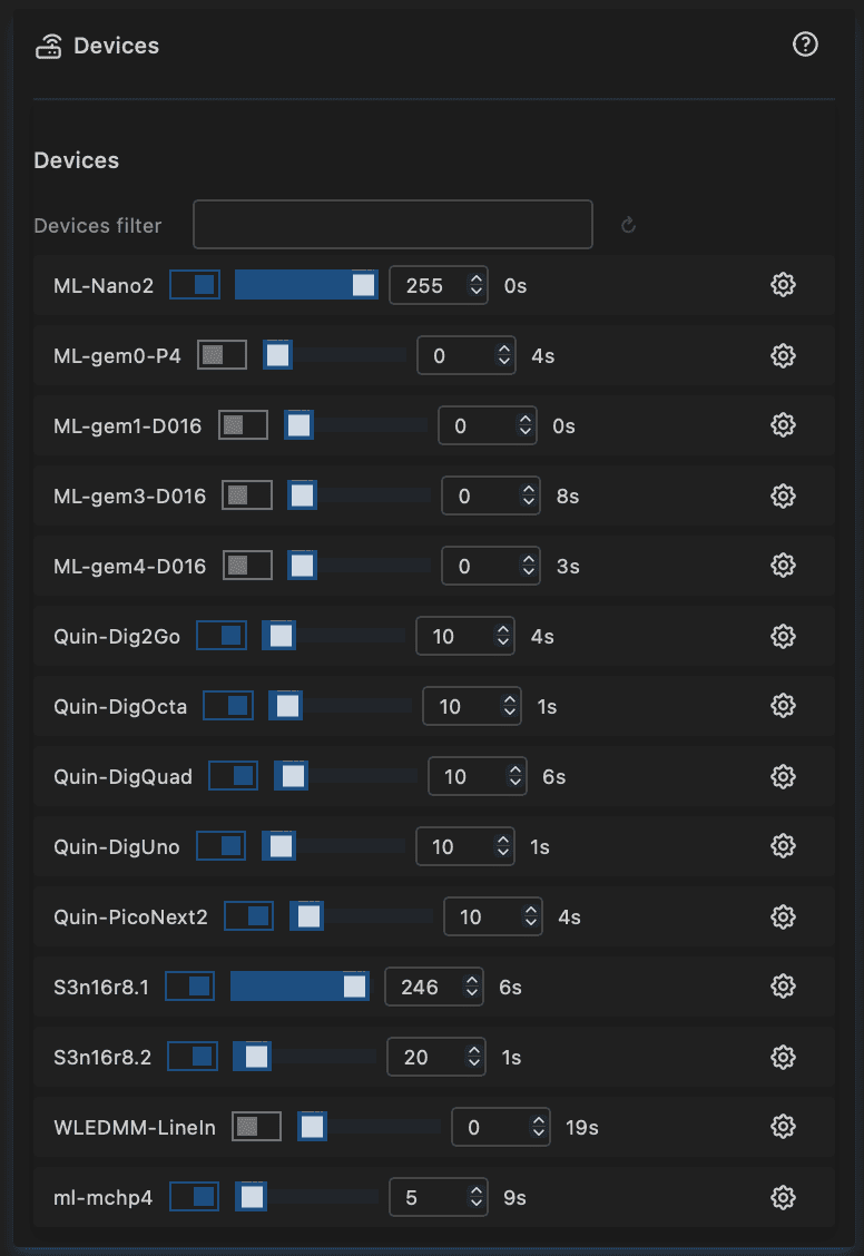 - Last Sync: how long ago a device update has been received (normally every 10s for a MoonLight device or when a control updated, WLED every 30s)