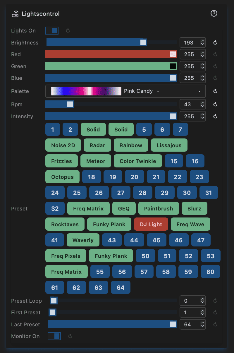 Monitor On — when enabled, the current LED frame is streamed to the Channels view in the UI. Disable to reduce WebSocket traffic when monitoring is not needed.