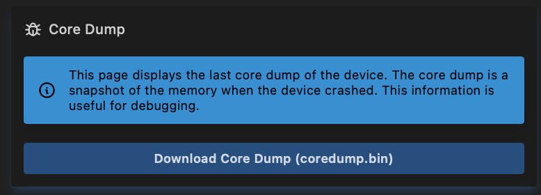 Download Core Dump (coredump.bin) - This button downloads the most recent core dump file saved on the device. The file is saved as coredump.bin to your local machine. If no crash has occurred since the last core dump was retrieved or cleared, the downloaded file may be empty or represent an older crash.